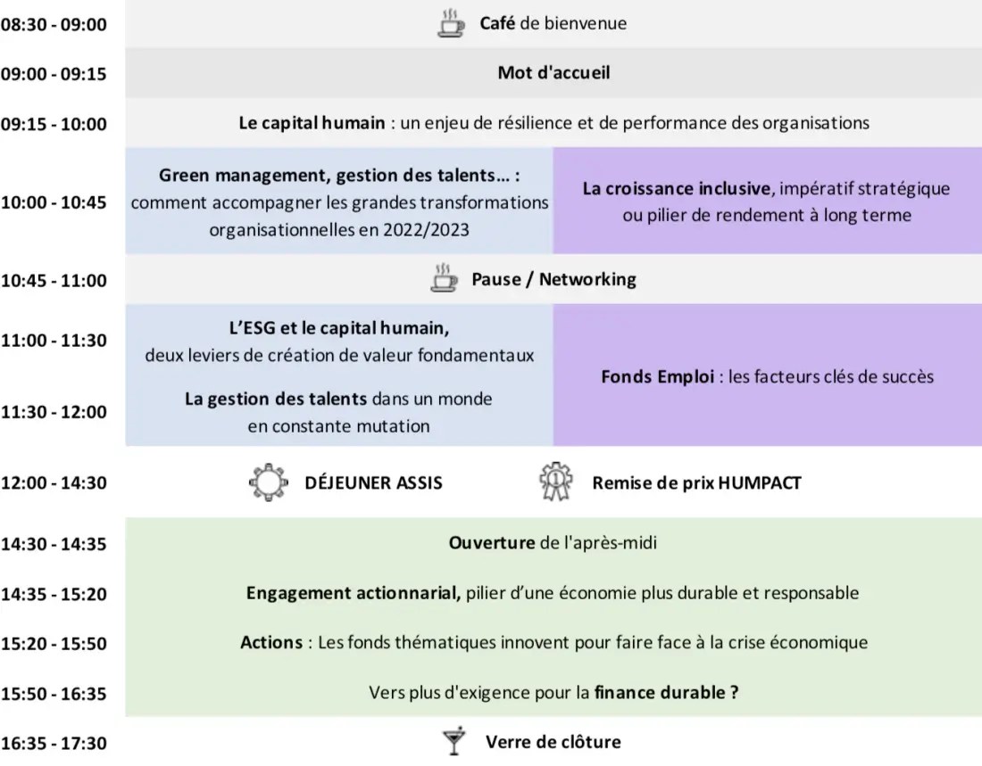 L’objectif de l’événement ISR et Capital humain est de faire le point sur l’importance de la réussite économique et de la transition juste en France et en Europe. Il s’agira d’analyser le rôle central du capital humain, du volet social de l’ESG et de l’investissement socialement responsable dans la performance des entreprises à travers trois parcours : « Investisseurs : stratégie sociale & performance », « Capital humain et Création de valeur » et « ISR & performance ».